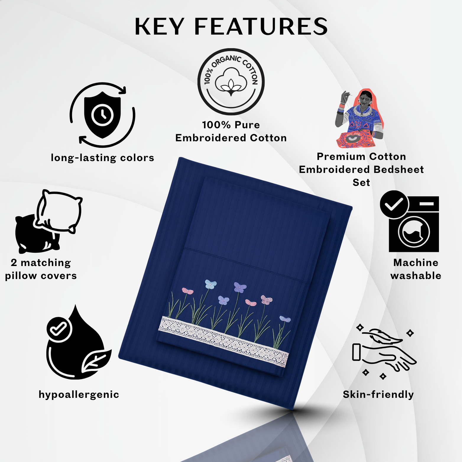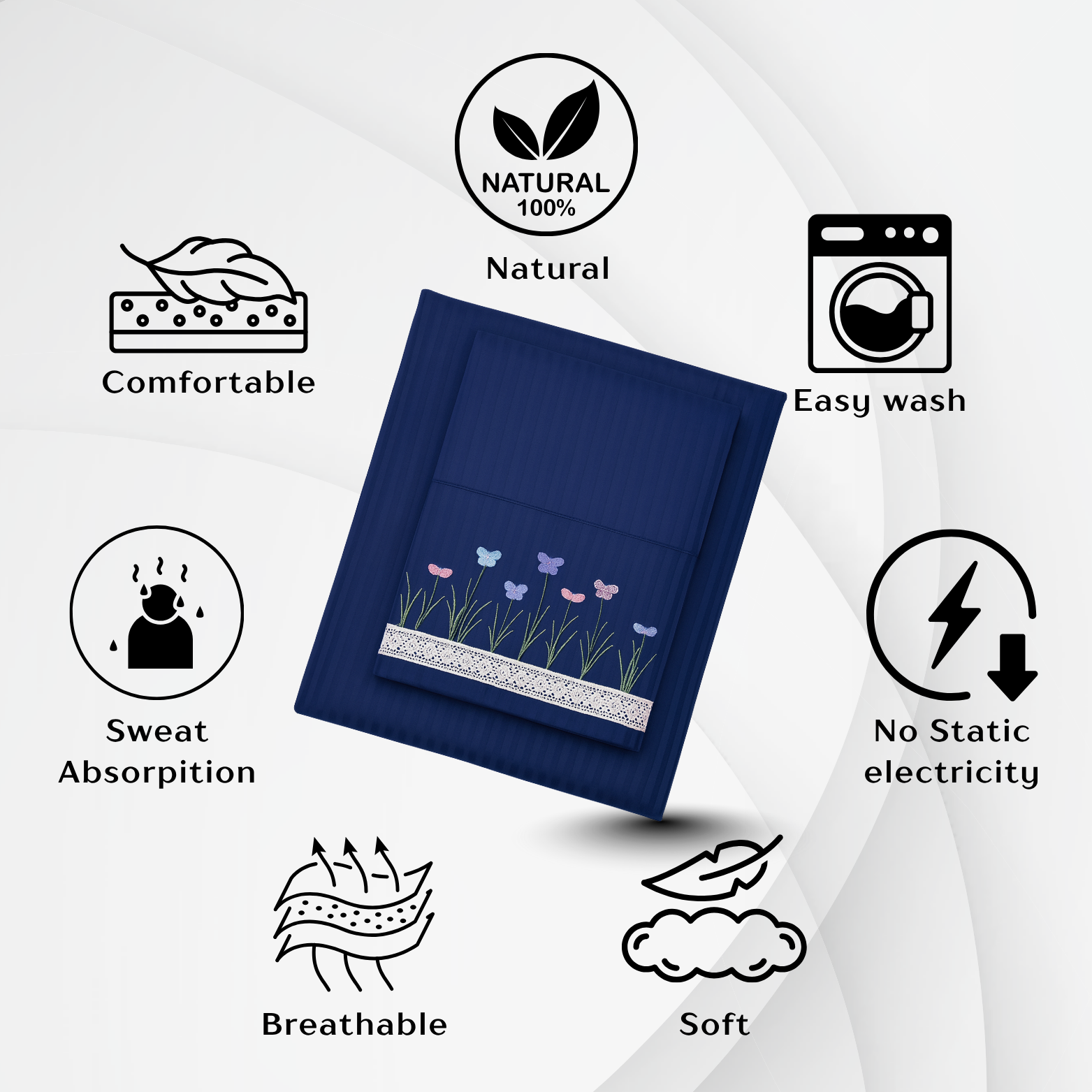 The subtle self-stripe texture enhances its premium appeal, while the navy blue shade creates a calm and sophisticated ambiance. Each set comes with two matching embroidered pillow covers, making it the perfect blend of comfort and style.